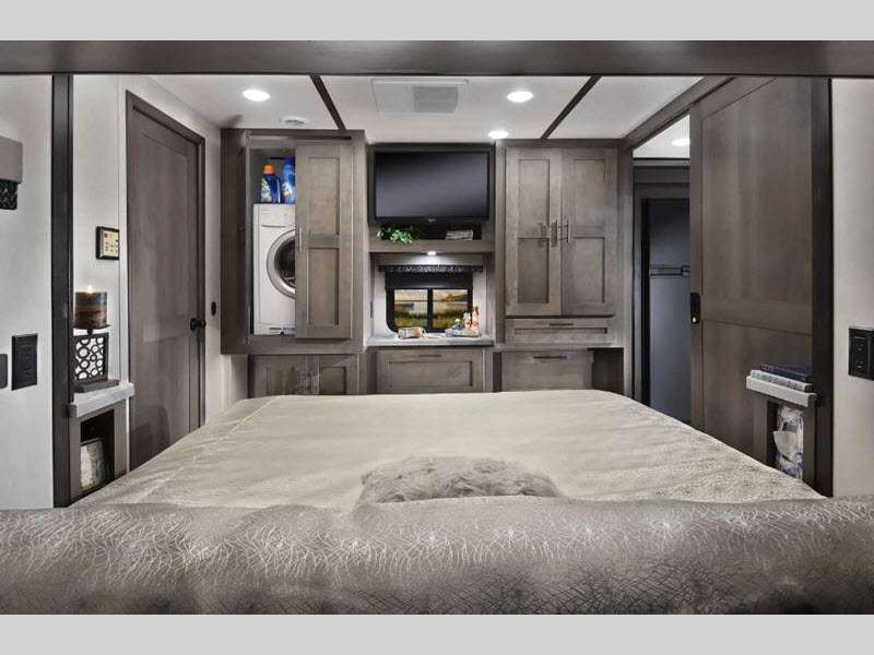 Sleeps 6 Slides 2 Length 35 ft 11 in Ext Width 8 ft 5 in Ext Height 12 ft 5 in Int Height 7 ft Interior Color Seaport Storm, Mink Exterior Color Pearl Grey Hitch Weight 5000 lbs GVWR 22000 lbs Fresh Water Capacity 50 gals Grey Water Capacity 52 gals Black Water Capacity 52 gals Furnace BTU 35000 btu Generator 6 KW NPS Yamaha Fuel Type Gas Engine 7.3L V8 Chassis Ford F53 Horsepower 335 hp Fuel Capacity 80 gals Wheelbase 228 in Number Of Bunks 1 Available Beds King Torque 468 ft-lb Refrigerator Type 12V Three Door Refrigerator Size 15 cu ft Cooktop Burners 3 Shower Size 36" x 30" Number of Awnings 1 Axle Weight Front 8000 lbs Axle Weight Rear 15000 lbs LP Tank Capacity 103 lbs Water Heater Capacity 6 gal Water Heater Type Gas/Electric AC BTU 28500 btu Basement Storage 184 cu. ft. TV Info LR 40" LED 12V TV, BR Flip-Up 32" LED 12V TV, Ext. 32" LED 12V TV Awning Info 17' Power with LED Light Washer/Dryer Available Yes Gross Combined Weight 26000 lbs Shower Type Standard Electrical Service 50 amp Similar Floorplans