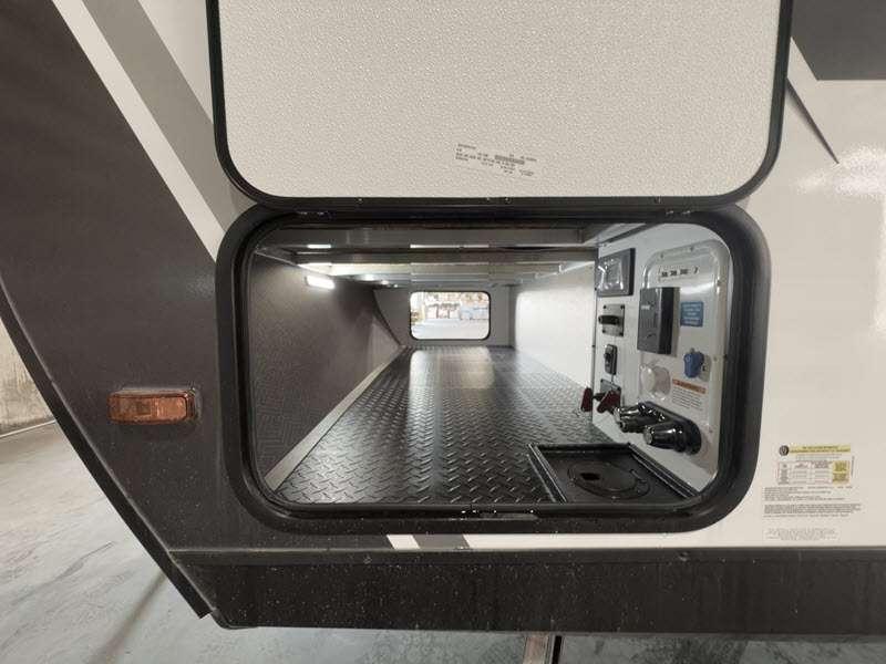 The gel-coated fiberglass exterior and one-piece roof membrane form the base that holds all of the many features, like the three-burner range with an oven, residential walk-in shower, high capacity furnace, and LED HDTV. The friction-hinge entry door won't fly away when you open it, and the residential countertops will let you set down dinner plates. There is a large panoramic window and LED lighting to keep your trailer feeling open, and the four packages included will provide even more features you won't want to camp without. Some of these features include a 200W solar panel, an accessory hitch, and a full width pass-thru storage!