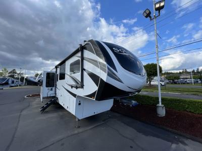 Sleeps 6 Slides 5 Length 42 ft 5 in Ext Width 8 ft 6 in Ext Height 13 ft 5 in Exterior Color Standard Graphics or Aurora, Midnight, Pearl Full-Body Paint Options Hitch Weight 3050 lbs GVWR 19000 lbs Dry Weight 15180 lbs Fresh Water Capacity 81 gals Grey Water Capacity 106 gals Black Water Capacity 53 gals Tire Size ST215/75R 17.5 LRH Furnace BTU 35000 btu Available Beds Queen Refrigerator Type 12V Refrigerator Size 20 cu ft Cooktop Burners 4 Shower Size 48" x 30" Number of Awnings 1 Axle Weight 8000 lbs LP Tank Capacity 30 lbs. Water Heater Type Tankless On Demand AC BTU 30000 btu TV Info LR LED Smart TV Awning Info 16' Power w/Integrated Lighting Axle Count 2 Washer/Dryer Available Yes Number of LP Tanks 2 Shower Type Shower w/Seat Electrical Service 50 amp Similar Fifth Wheel Floorplans