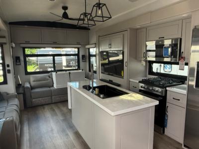Whether you want to live in this fifth wheel or travel for long periods at a time, you will enjoy the spacious main living and kitchen area with dual slide outs as well as the bedroom with a slide out king bed. You will also find a walk-in closet with hamper and prepped space for a washer/dryer option, and a flip-top dresser with 32" TV. Easily get cleaned up in the full bathroom which also has linen storage. The cook will have a residential refrigerator to store all the cold items and beverages, a kitchen island, a pantry and a residential 24" stove. The 50" Smart LED HDTV with fully digital HDMI output and home entertainment system with subwoofer and fireplace below will provide a cozy place to watch your shows while relaxing on the theater seats, the tri-fold sofa, or the roll-top dinette table.