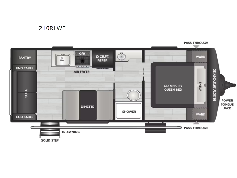 Sleeps 4 Length 0 ft Interior Color Stonebriar Furnace BTU 30000 btu Available Beds Olympic RV Queen Refrigerator Type 12V Refrigerator Size 10.7 cu ft Cooktop Burners 3 Number of Awnings 1 Water Heater Type Tankless AC BTU 15000 btu Awning Info 16' Power w/LED Lights Axle Count 2 Shower Type Standard Similar Travel Trailer Floorplans