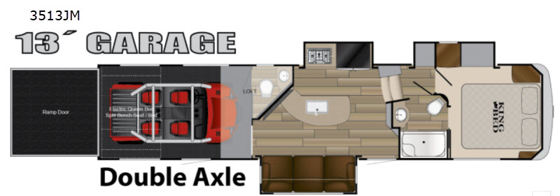 13' Garage with Electric Queen Bed: The spacious garage offers 13 feet of storage space for all your toys and gear. Once you're parked and unloaded, the garage transforms into a versatile living area with a split bench seating arrangement and an electric queen bed that lowers for additional sleeping space.