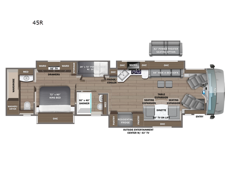 Sleeping for Everyone – 28" x 72" power bunk beds provide extra sleeping space for family or guests.